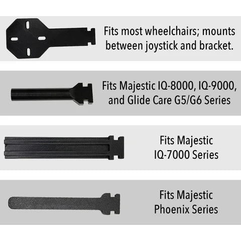 The Universal version fits most wheelchairs and scooters with bracket mounting space between the joystick and joystick bracket.