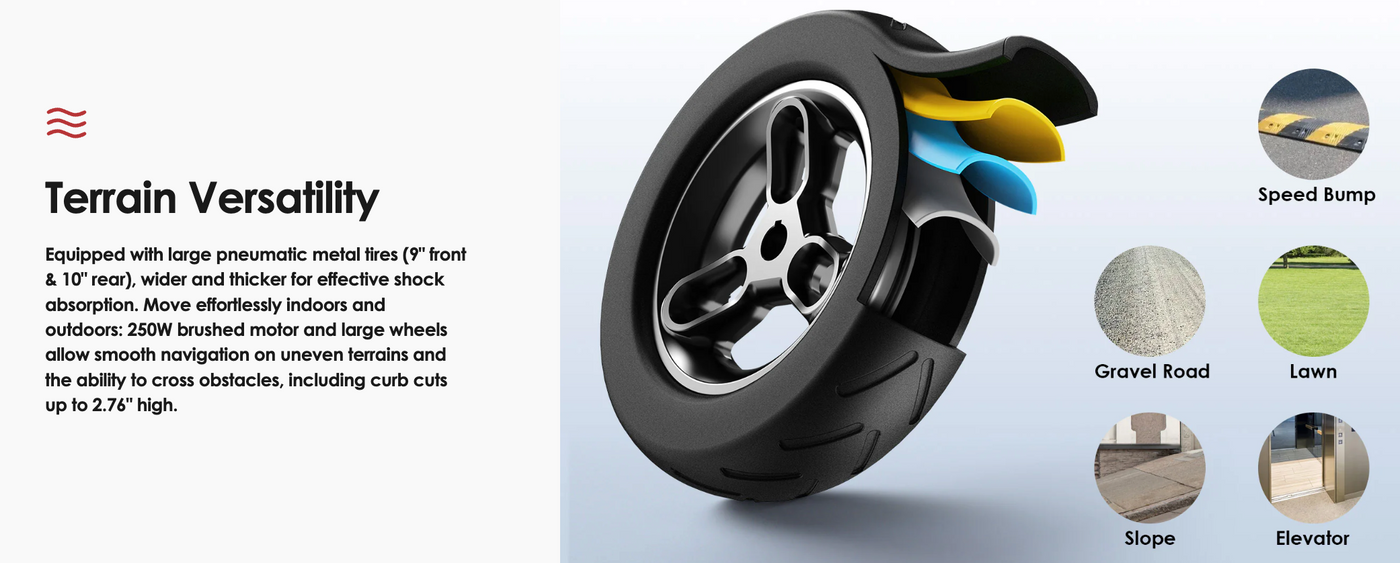 265 lb capacity · Up to 25 miles · 6.2 mph top speed · 250W motor · 4-wheel stability · 9″/10″ pneumatic tires · 2.76″ ground clearance · Full detachable frame (trunk-friendly)