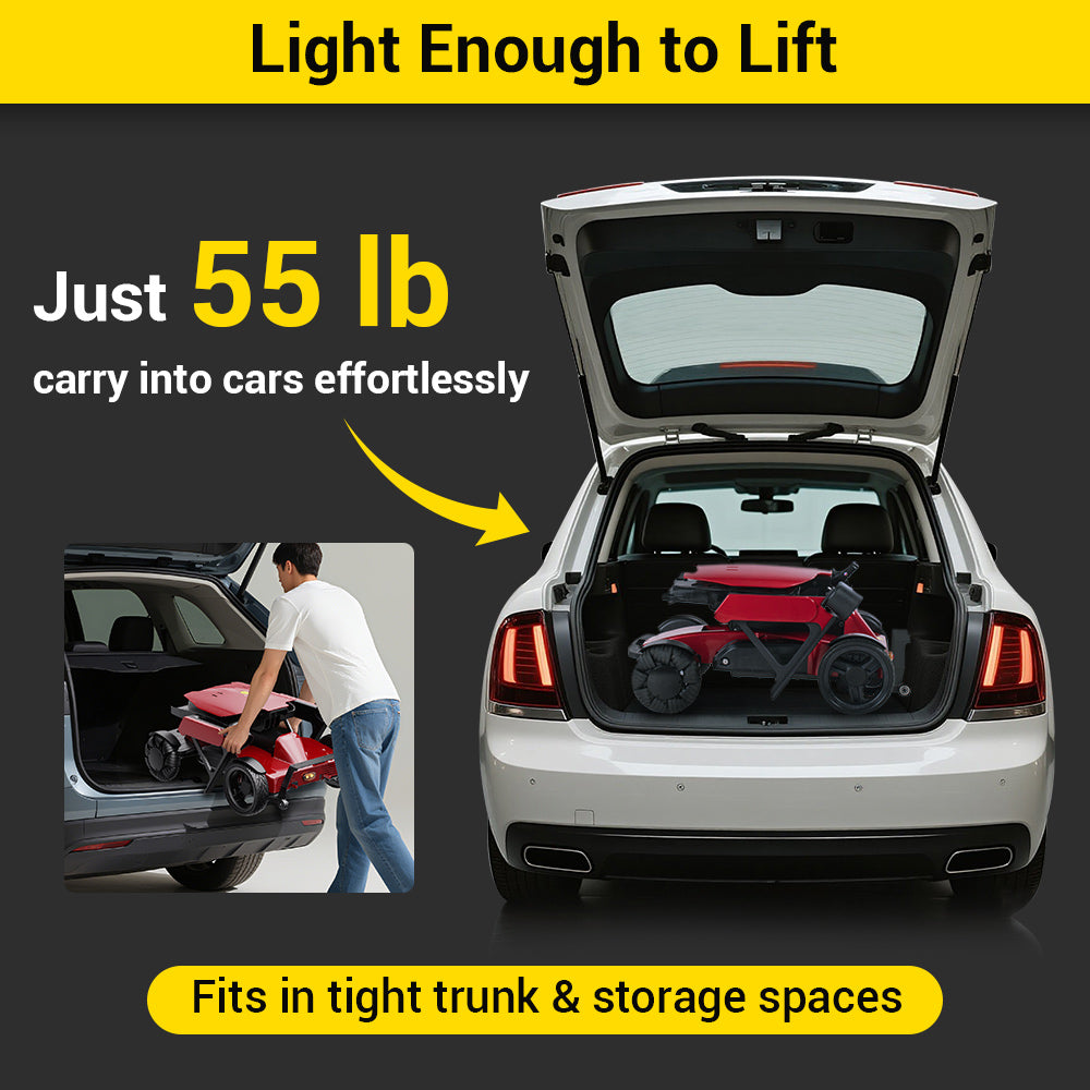 55 lb foldable frame • 265 lb capacity • Folds to 33.9″ × 23.6″ × 15.0″ • Dual 200W (400W total) motors • Up to 28 miles with two 11.4Ah batteries • Mecanum omni-wheels • Electromagnetic brakes • Adjustable seat height 15.75–23.62″