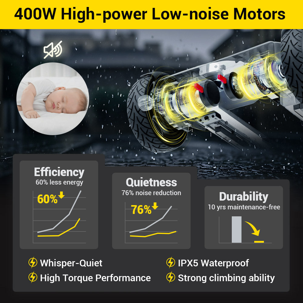 Precision Dual Motors (400 W Total): Two 200 W brushless motors deliver smooth acceleration, low noise, and reliable power.